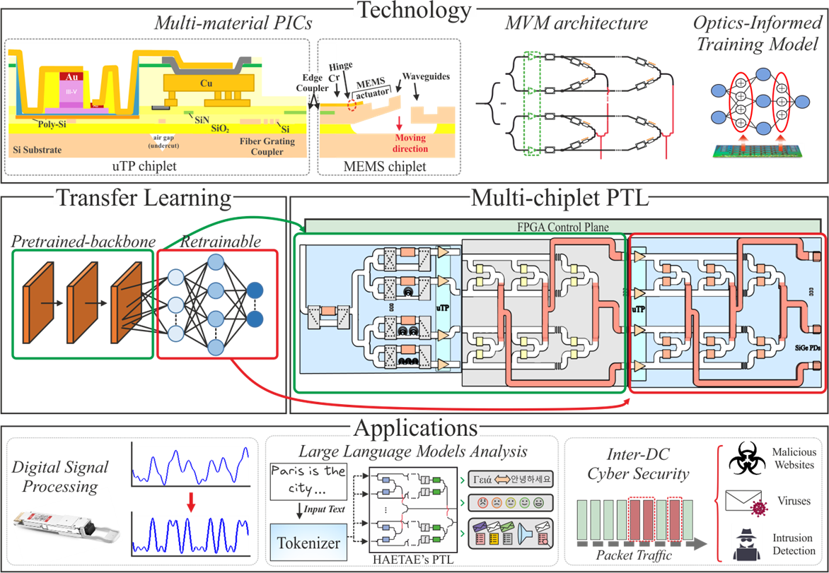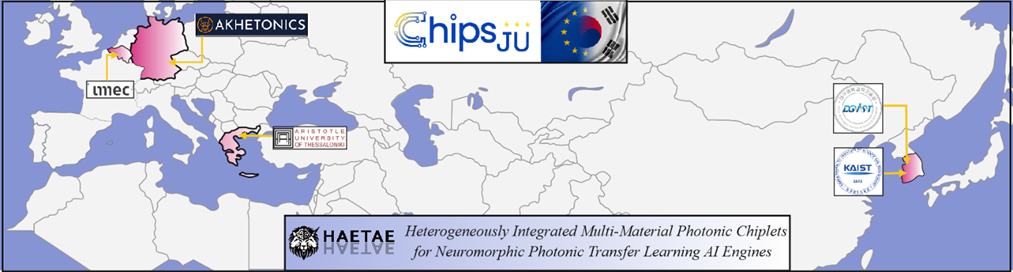 HAETAE is a 3-year long Horizon Chips Joint Undertaking project as part of an EU-ROK partnership, aiming to establish a novel computing paradigm by developing a multi-material PIC technology platform and align this along photonic Neural Network architectures capable of operating along the principles of Transfer Learning methods. It will deploy a co-integrated PIC platform that brings together the best-in-class material platforms through micro-transfer-printing and hybrid multi-chiplet bonding and proceeds along the best-in-class linear optical circuit architectures, combining: a) Si/Si3N4/SiGe photonics for high-speed fan-in, weighting and fan-out computational stages, b) InP actives for on-chip amplification, and all-optical non-linearities, for speed- and SNR-enhancement in neuromorphic photonic circuit layouts, c) Si/Si3N4 non-volatile Micro-Electro-Mechanical Systems (MEMS) structures for energy-efficient and non-volatile weighting, d) embedded FPGA-based control plane for the efficient programmability of MEMS and chip-configuration. It aims to finally deliver a Photonic Transfer Learning engine that can support one order of magnitude improvements along all critical performance metrics of AI chipsets: energy efficiency of <19fJ/MAC and on-chip computational power that can scale to ~4.1PMAC/s. HAETAE aims to highlight the versatility and flexibility of its twofold photonic transfer learning accelerator by targeting three discrete application sectors in communications and computing: i) real-time threat detection processor for DC cybersecurity applications, ii) DL and AI computing as a LLM transformer, and iii) an optics-enabled AI enhanced DSP processor for IM/DD transceivers.
