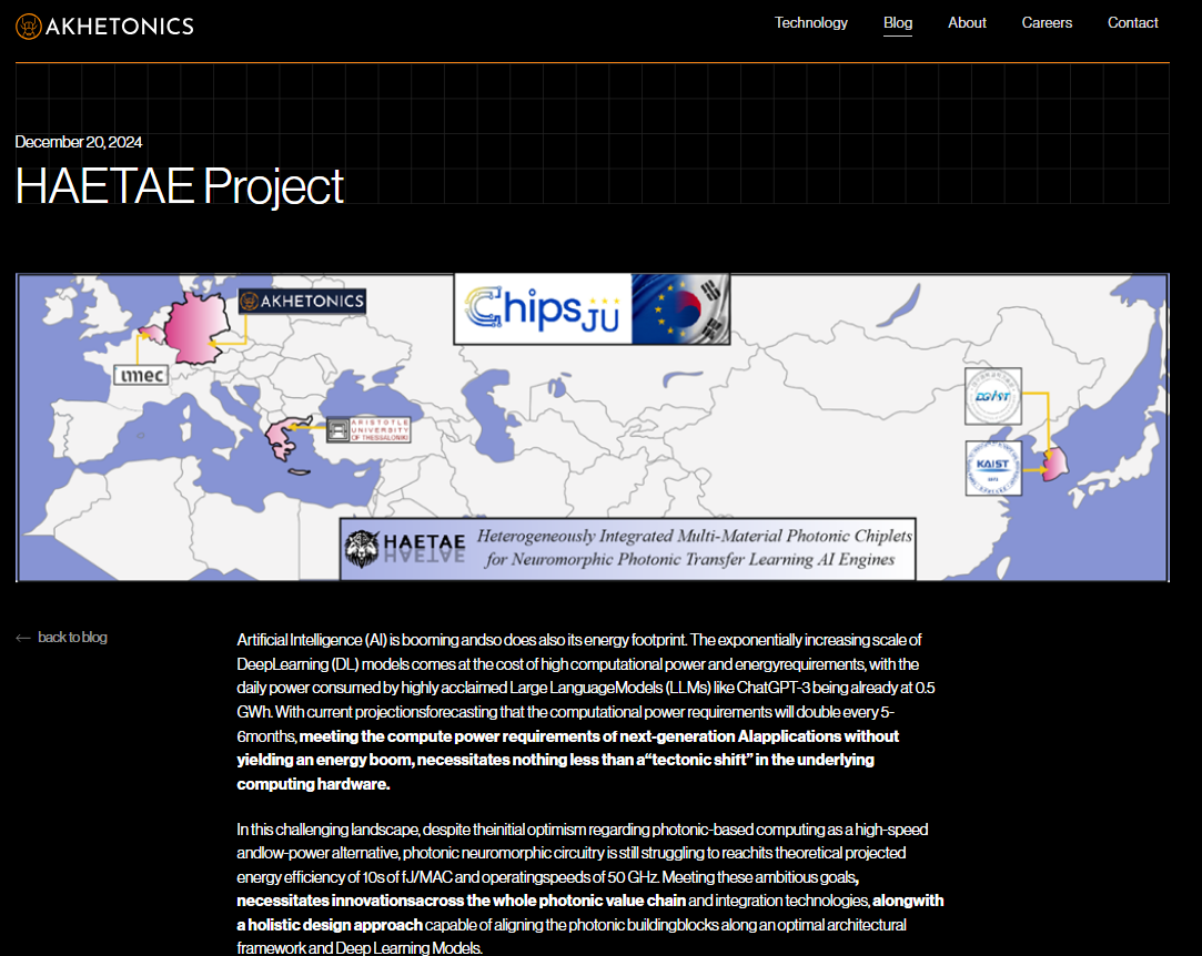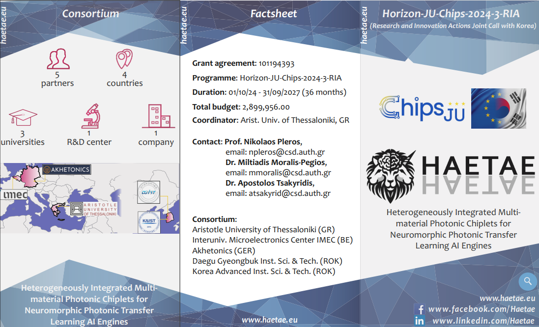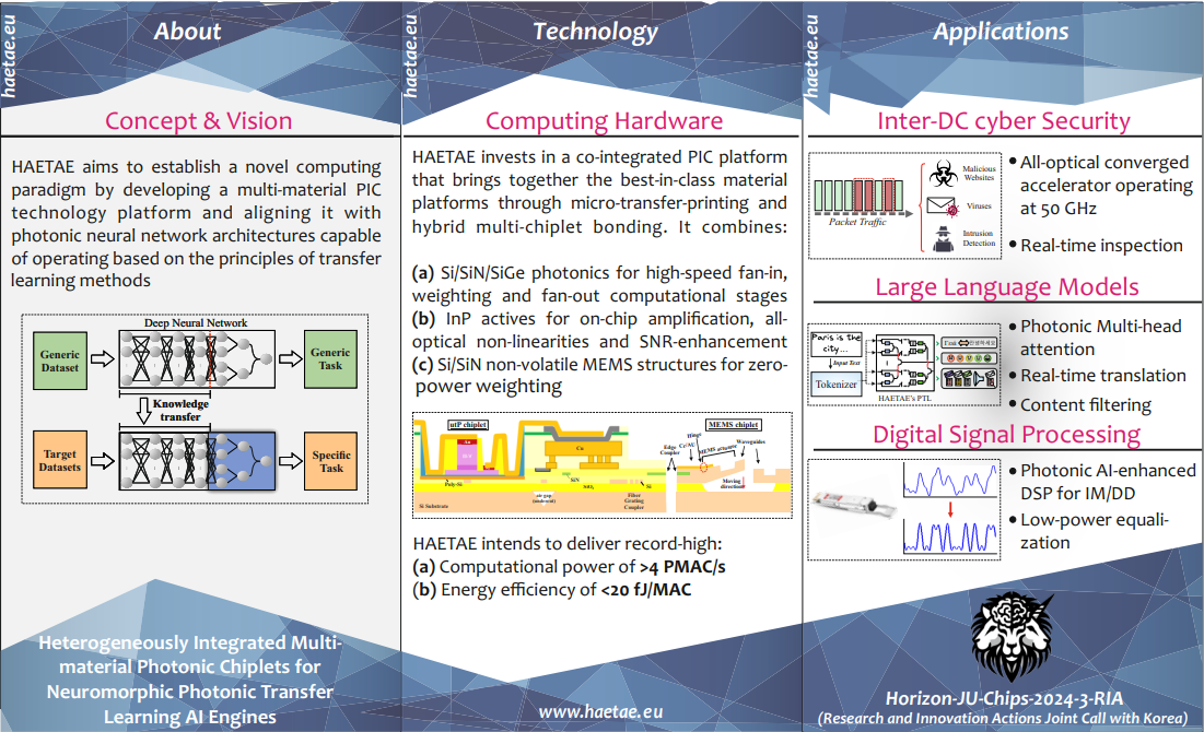 HAETAE – “Heterogeneously Integrated Multi‐material Photonic Chiplets for Neuromorphic Photonic Transfer Learning AI Engines” – is a new 3-year long HORIZON-JU-Chips / Nation Research Fund (Republic of Korea) project, launched on October 1st, 2024, aiming to release a whole new class of energy efficient Transfer Learning -enhanced photonic accelerators with up to 50 Gbaud operating frequencies and 15x better energy efficiency, comparing to current state-of-the art.